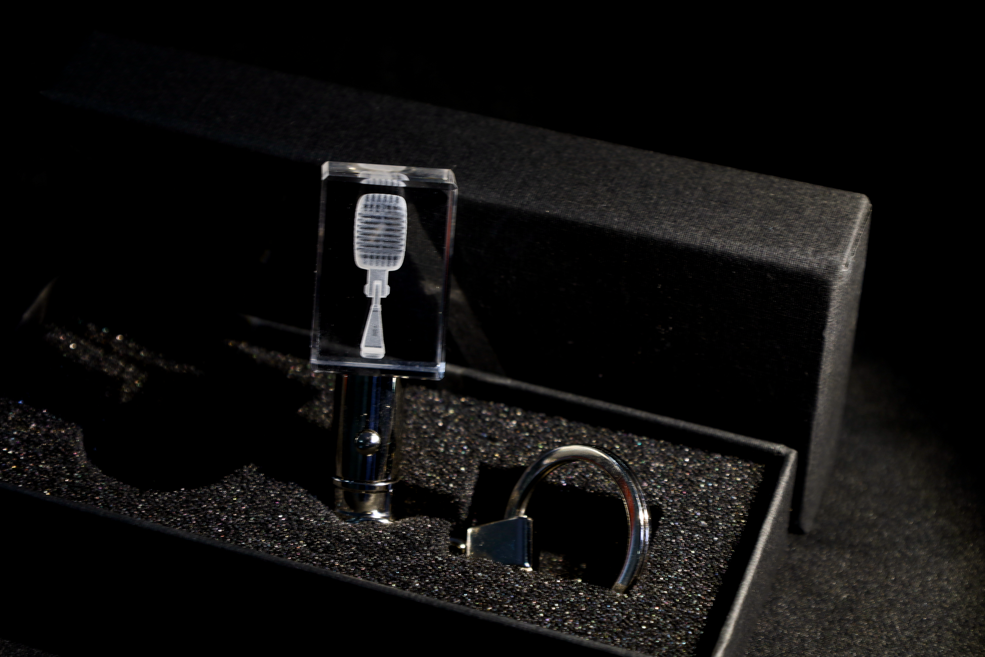 In de sleutelhanger is een verfijnd LED-lampje geïntegreerd. Met één druk op de knop licht het kristal op en lijkt de 3D-gravure bijna te zweven in het glas. De details van de vintage microfoon en jouw persoonlijke gravure worden dan nóg intenser en indrukwekkender zichtbaar.