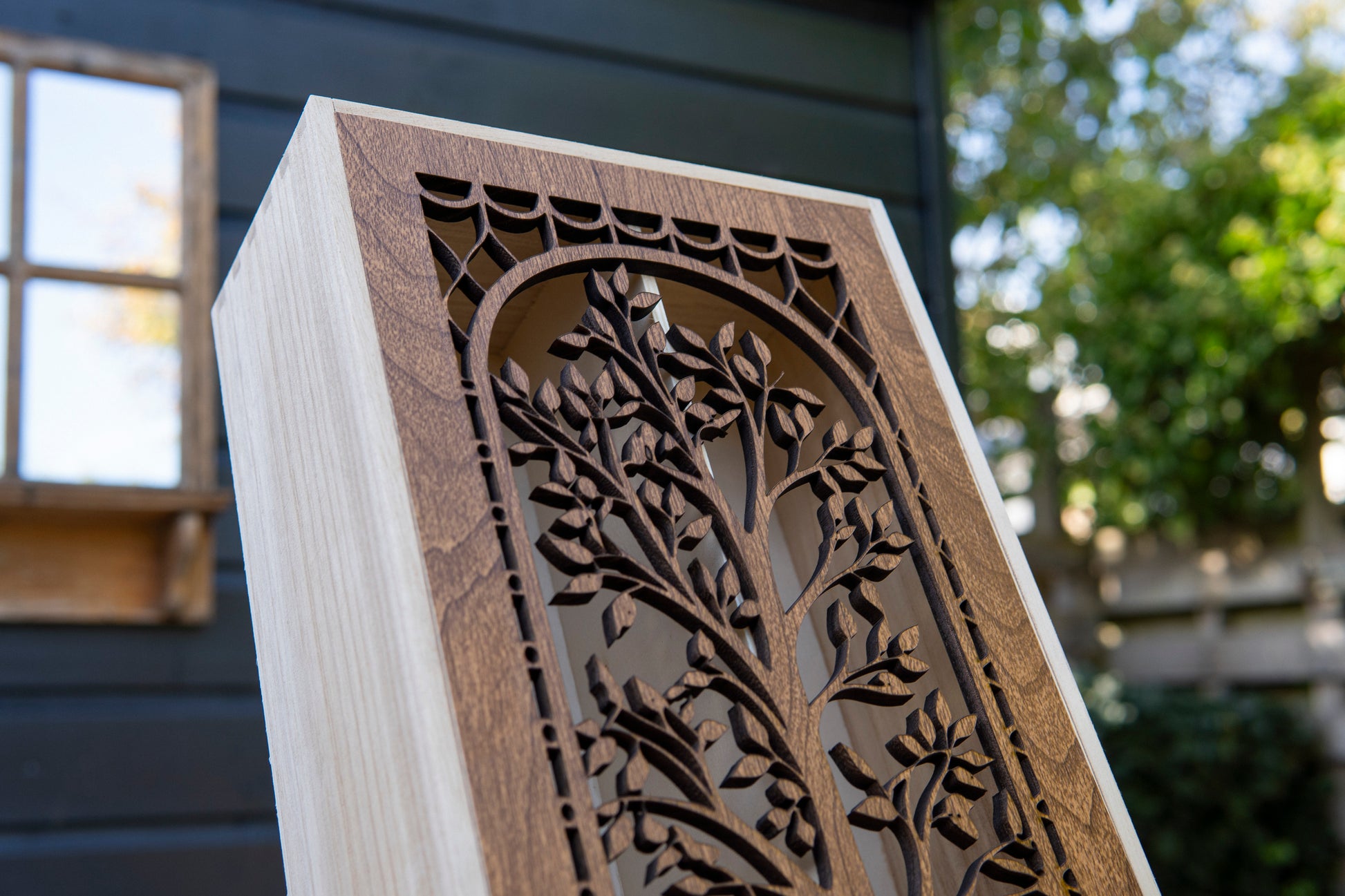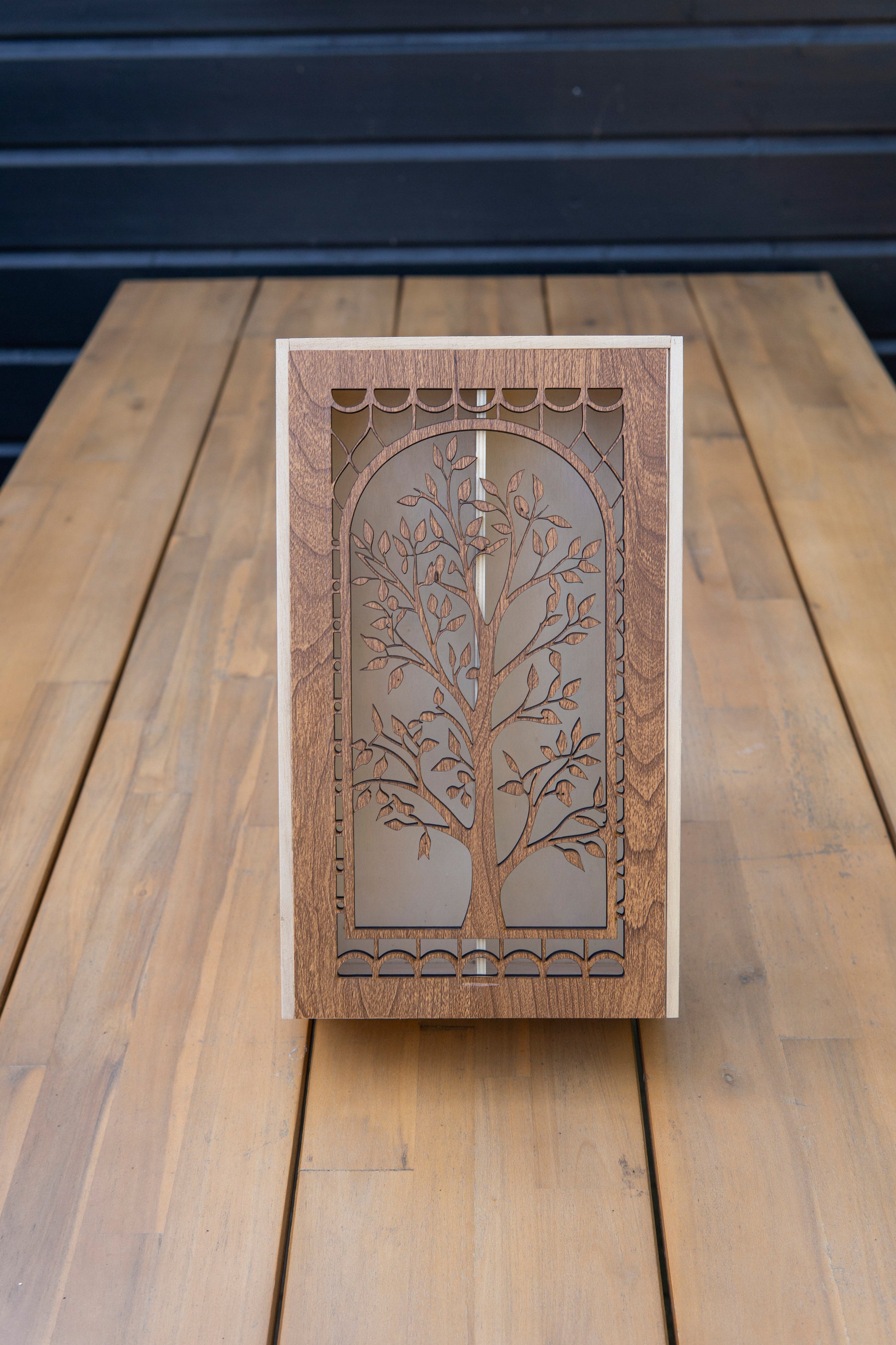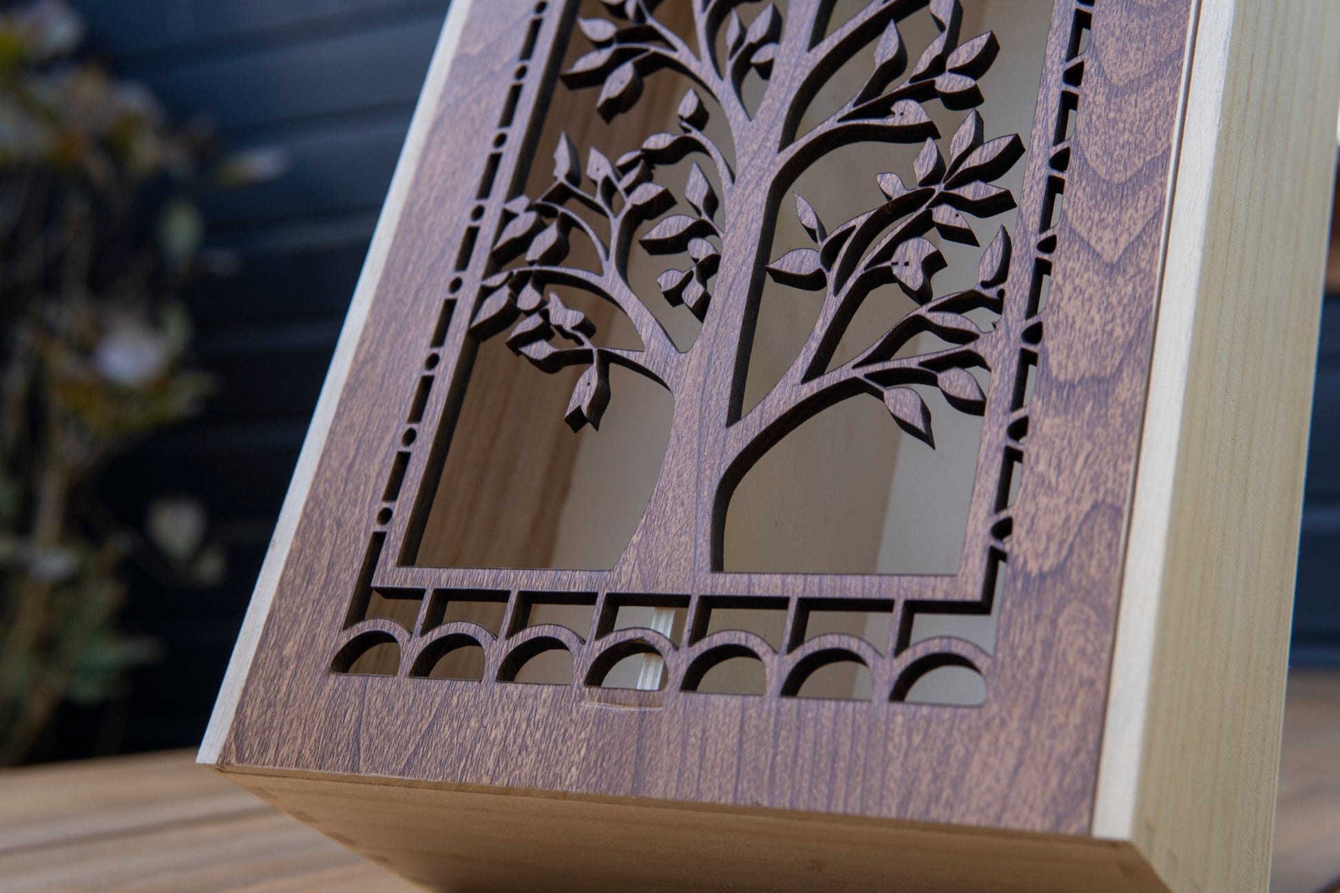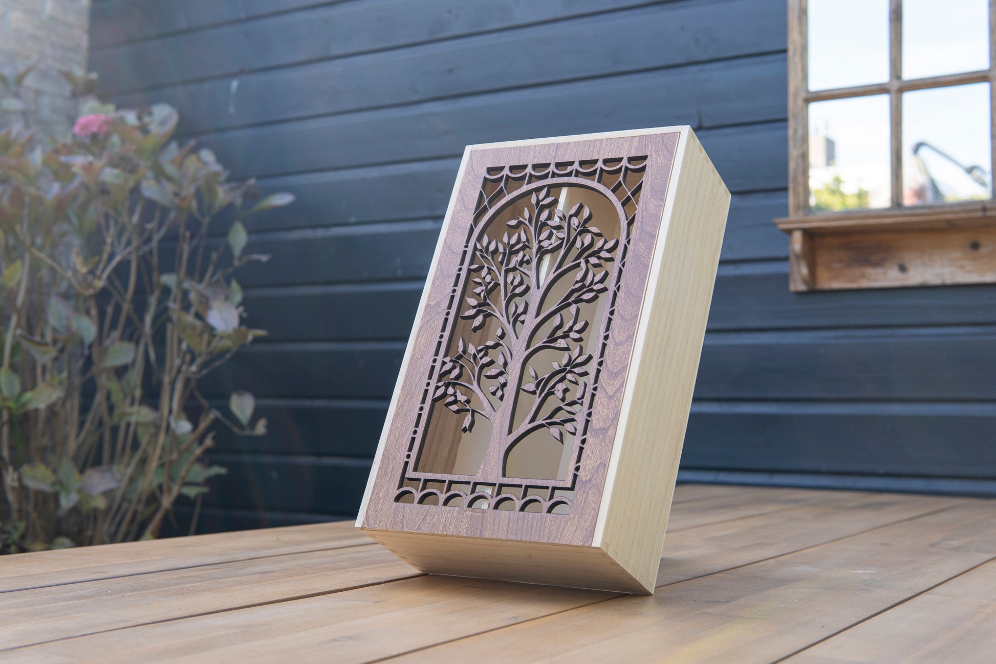 Breng wijn, kunst en muziek samen in één verfijnd kunstwerk. Dit exclusieve wijnkistje is met de hand vervaardigd en ontworpen voor twee bijzondere flessen wijn. Elk kistje is een uniek kunstobject, zorgvuldig opgebouwd uit hout met fineer met een prachtig uitgesneden boom.
