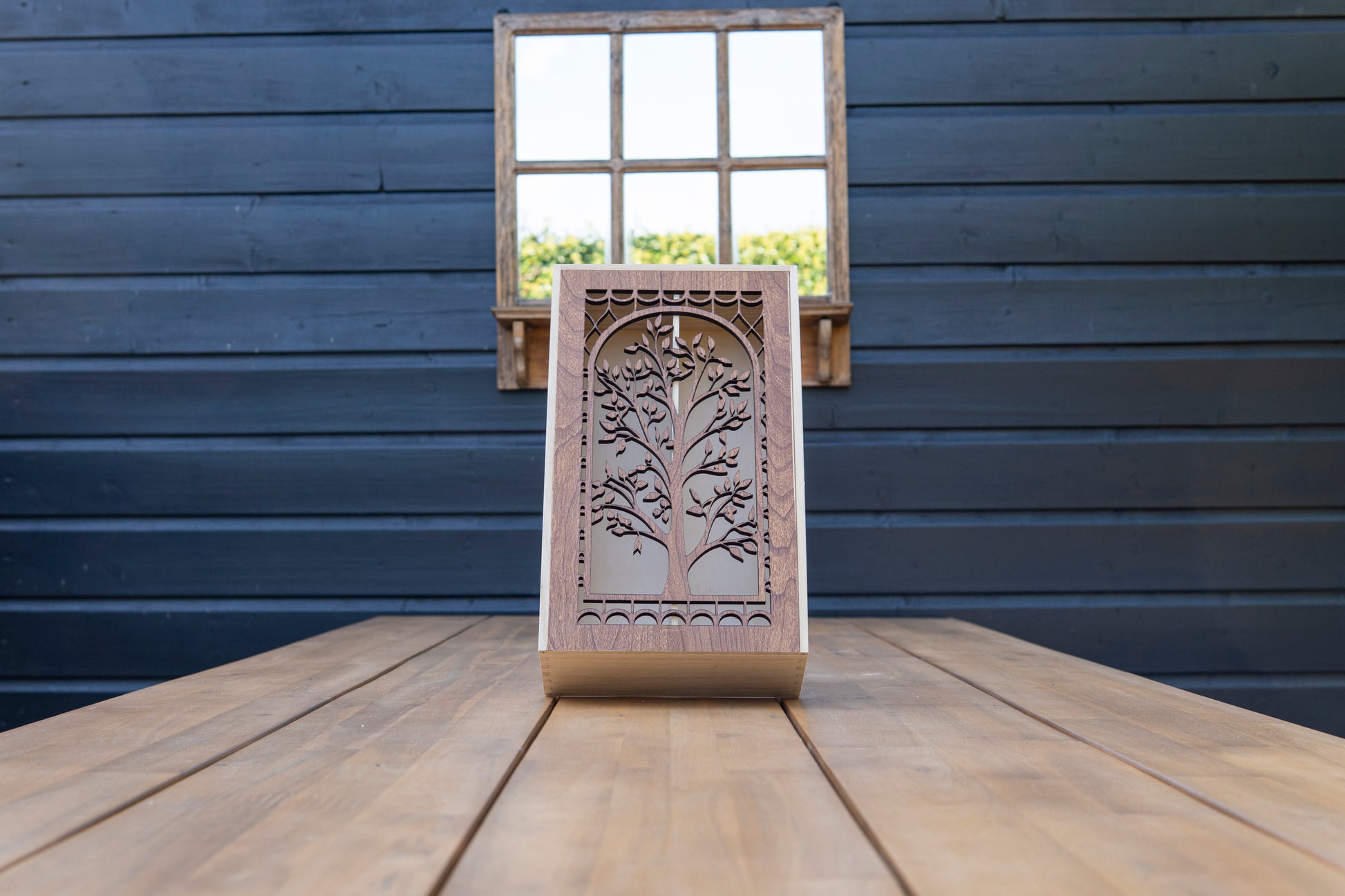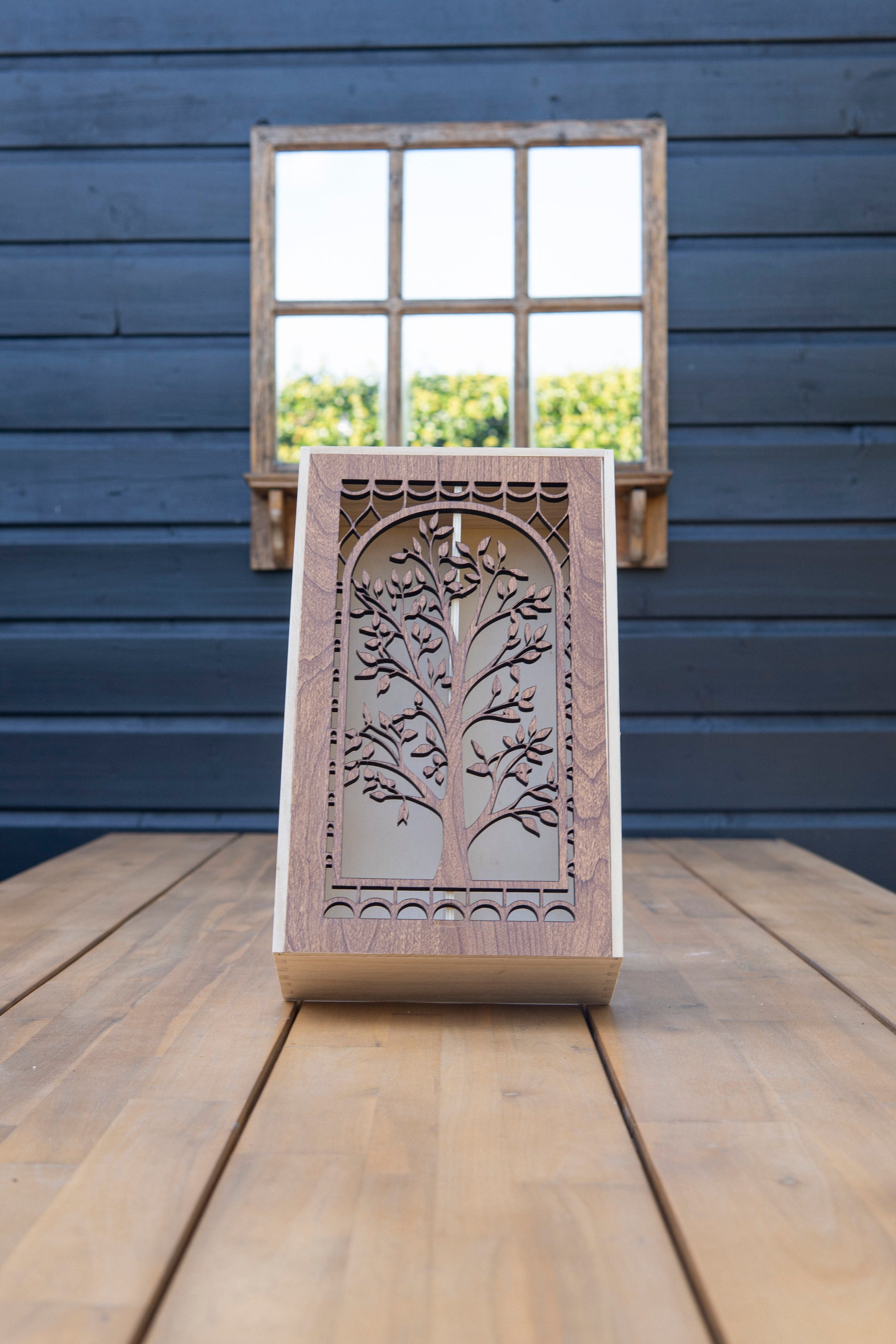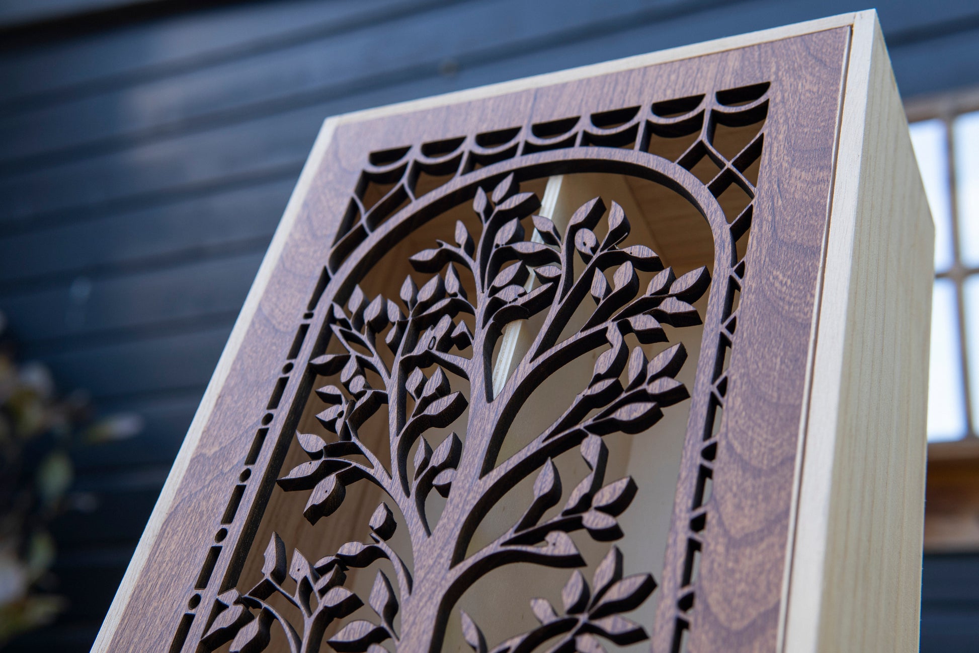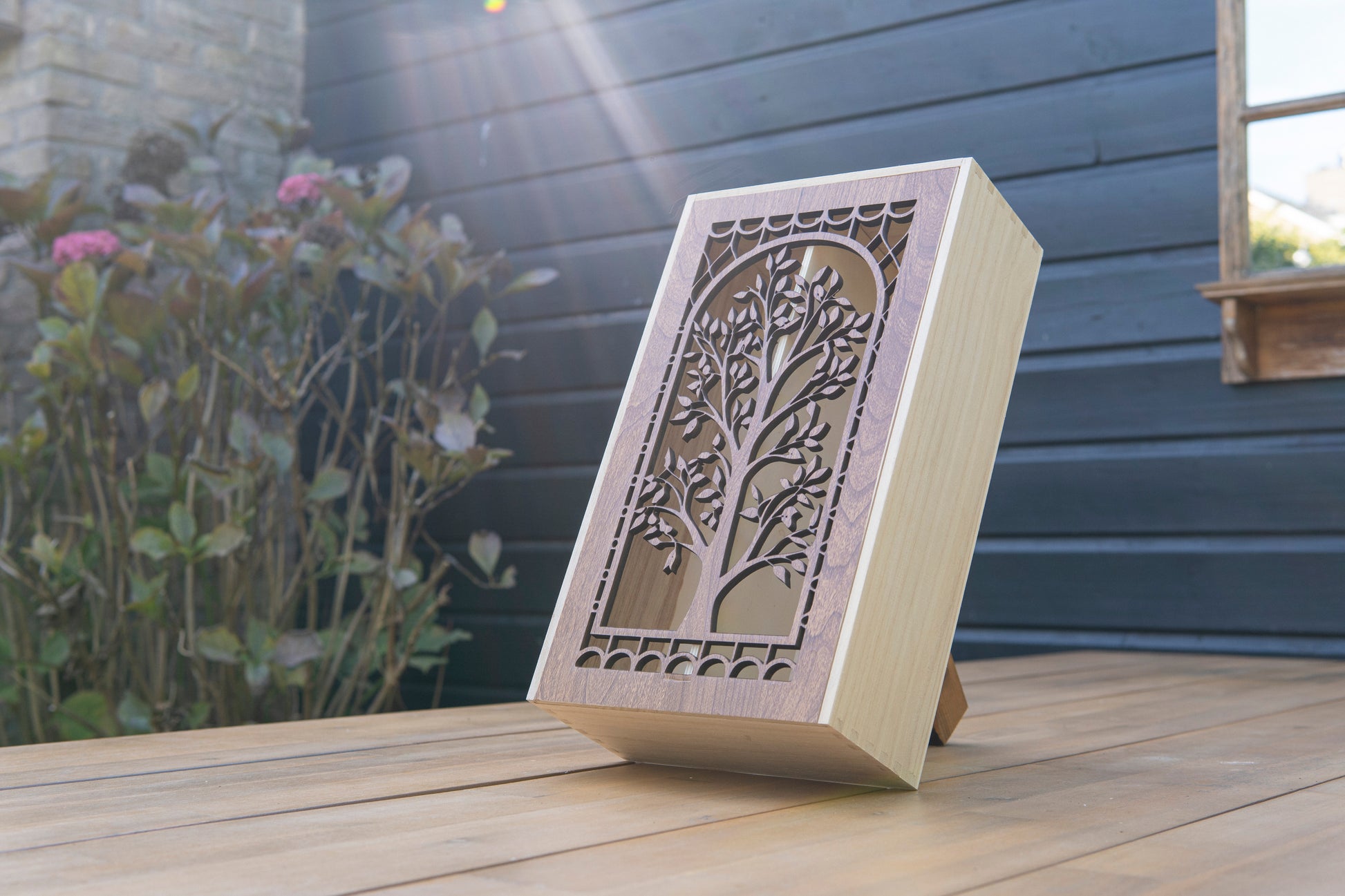Breng wijn, kunst en muziek samen in één verfijnd kunstwerk. Dit exclusieve wijnkistje is met de hand vervaardigd en ontworpen voor twee bijzondere flessen wijn. Elk kistje is een uniek kunstobject, zorgvuldig opgebouwd uit hout met fineer met een prachtig uitgesneden boom.