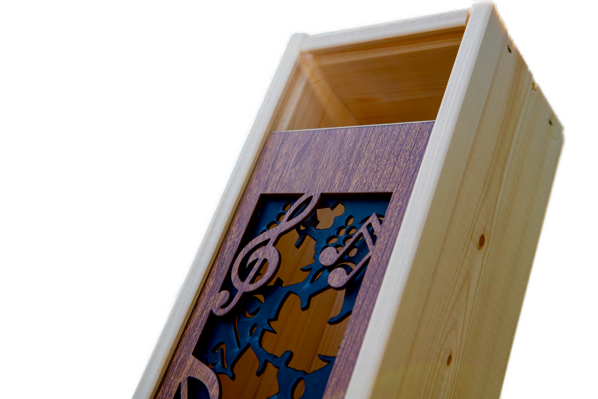 Breng wijn, kunst en muziek samen in één verfijnd kunstwerk. Dit exclusieve wijnkistje is met de hand vervaardigd en ontworpen voor één bijzondere fles wijn. Elk kistje is een uniek kunstobject, zorgvuldig opgebouwd uit meerdere lagen hout met een prachtig uitgesneden gitaar – een subtiele ode aan muzikaliteit en ambacht.