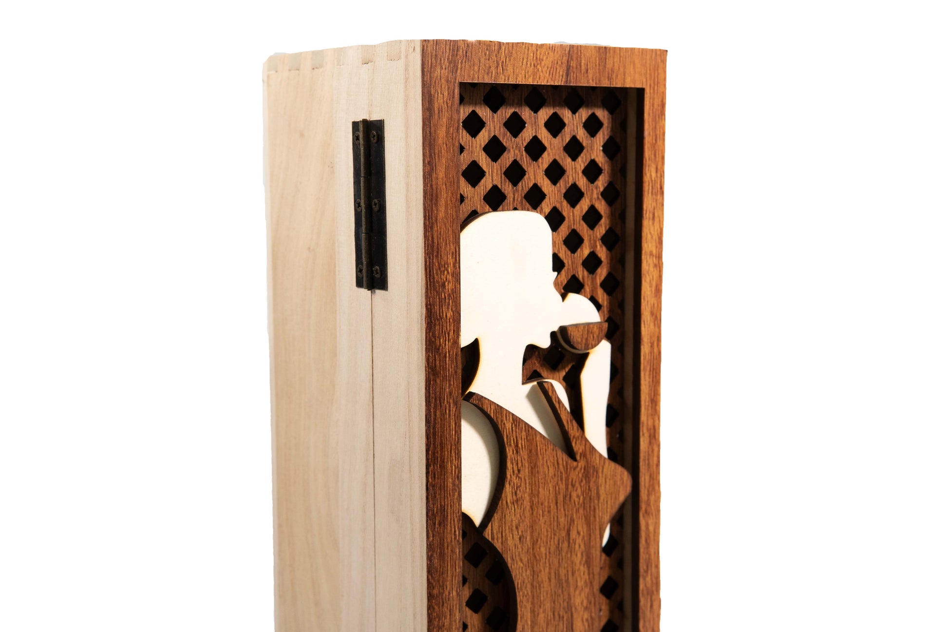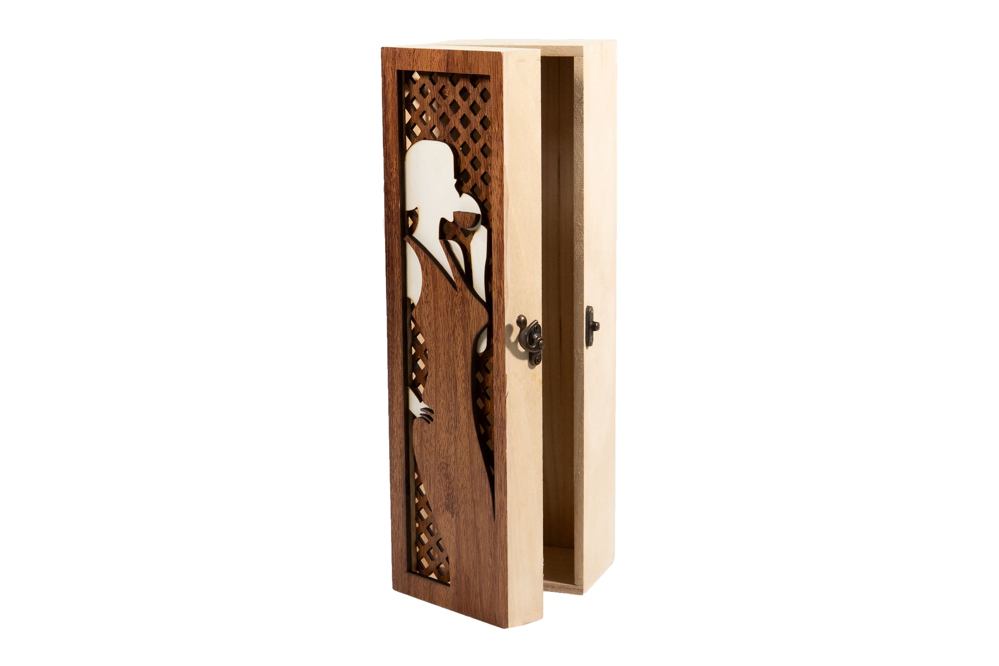 Breng wijn, kunst en exclusiviteit samen in één verfijnd kunstwerk. Dit wijnkistje is met de hand vervaardigd en ontworpen voor één bijzondere fles wijn. Elk kistje is een uniek kunstobject, zorgvuldig opgebouwd uit meerdere lagen hout met een prachtig uitgesneden wijn drinkende dame.