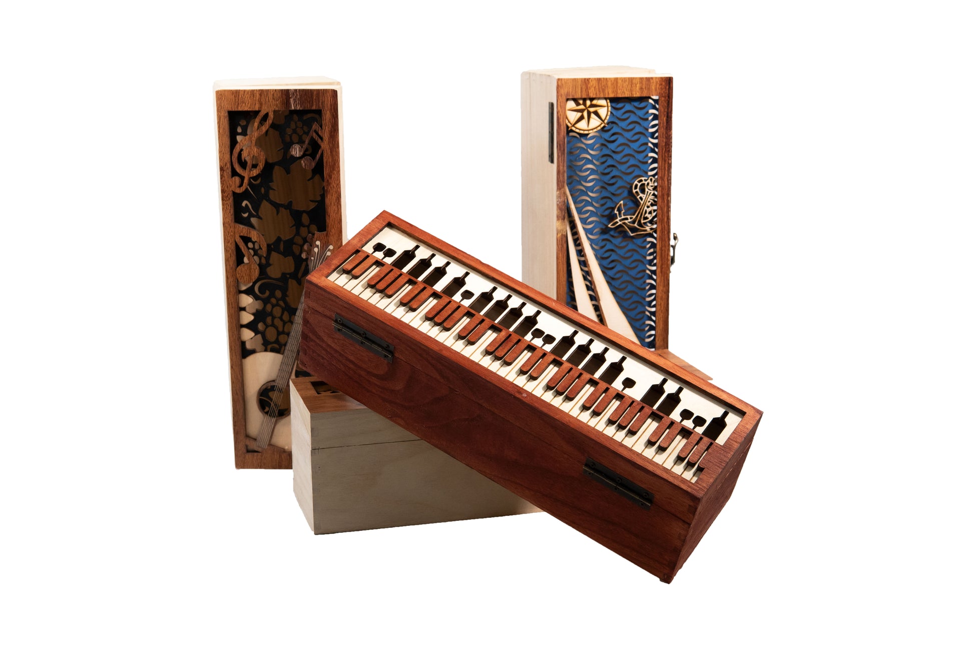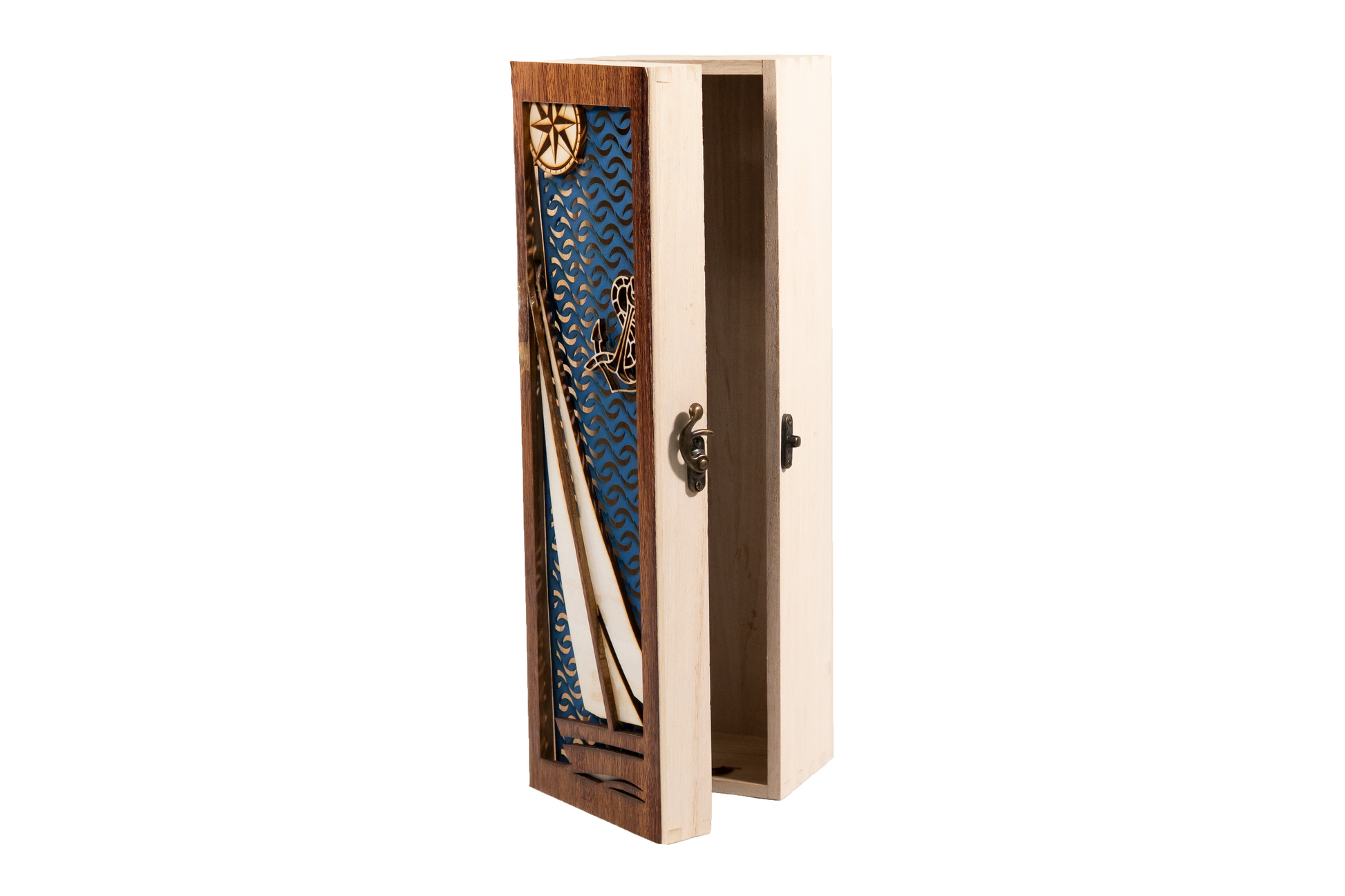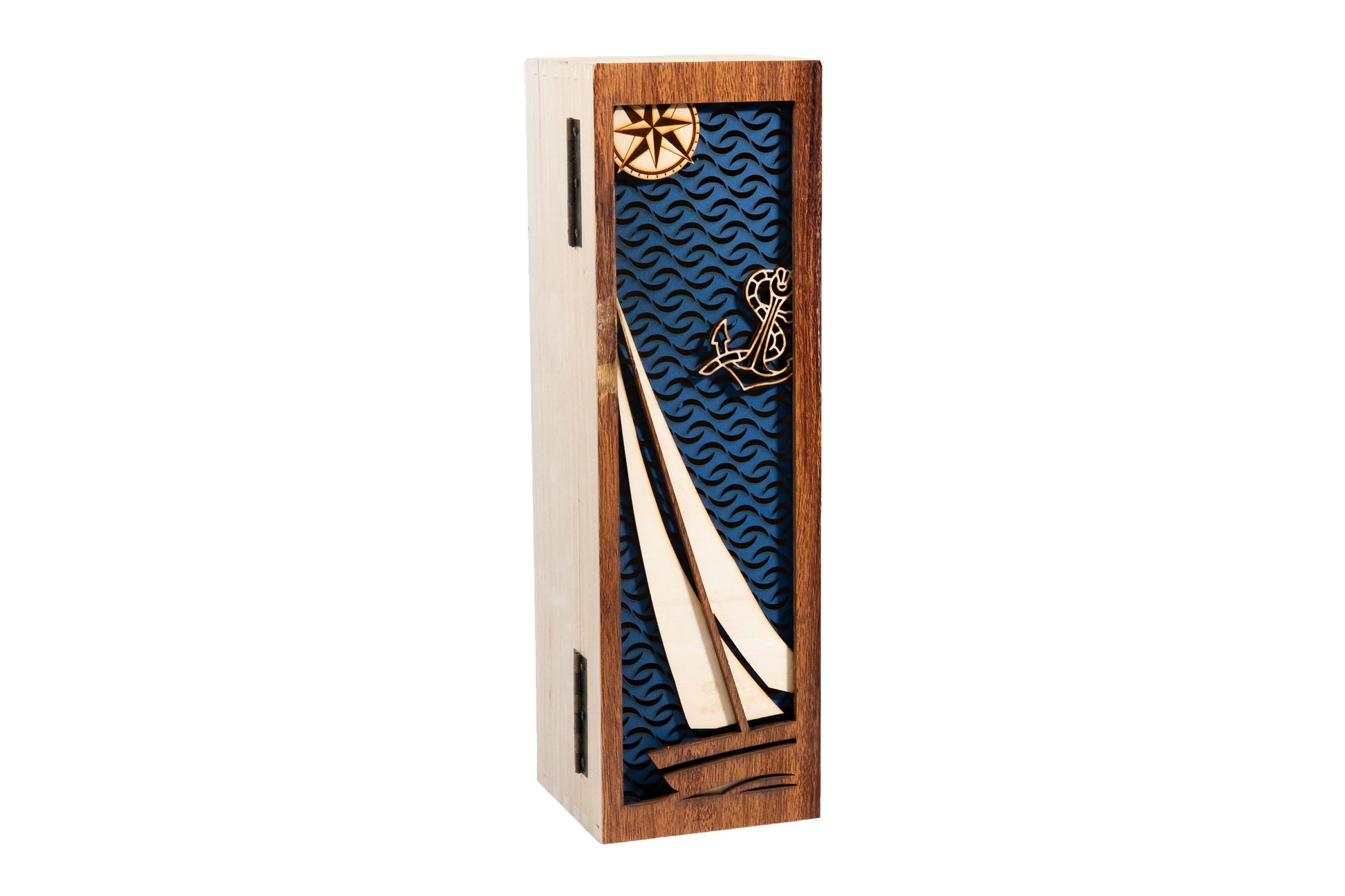 Breng wijn, kunst en zeilen samen in één verfijnd kunstwerk. Dit exclusieve wijnkistje is met de hand vervaardigd en ontworpen voor één bijzondere fles wijn. Elk kistje is een uniek kunstobject, zorgvuldig opgebouwd uit meerdere lagen hout met een prachtig uitgesneden zeilboot – een subtiele ode aan de nautische wereld.