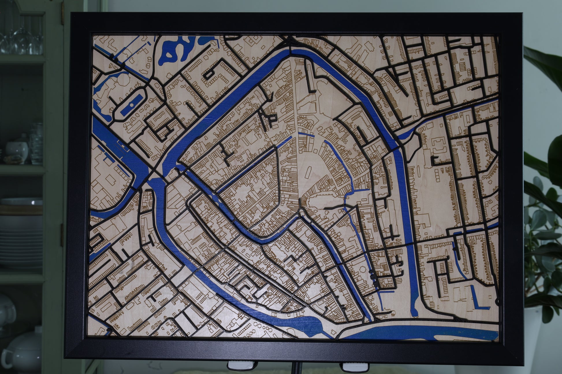 Bring your love for Gouda to life with this unique 3D wooden map. Carefully designed and laser-cut from multiple layers of wood, this map is finished with a deep blue water layer. The clear plexiglass top layer (included with the framed option) adds a luxurious touch while protecting the artwork from dust and damage. Perfect as a personal gift, stylish wall decoration, or a keepsake of your favorite place. This is a one-of-a-kind piece, handmade with care. Choose your variant: small, large, framed, or unframed.
